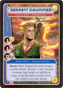 | Card Text: | React: When Serpent Drummer targets a melee attack, discard 1 card: Serpent Drummer may target an additional super using the same combat tactic. The attack is an area attack. |
